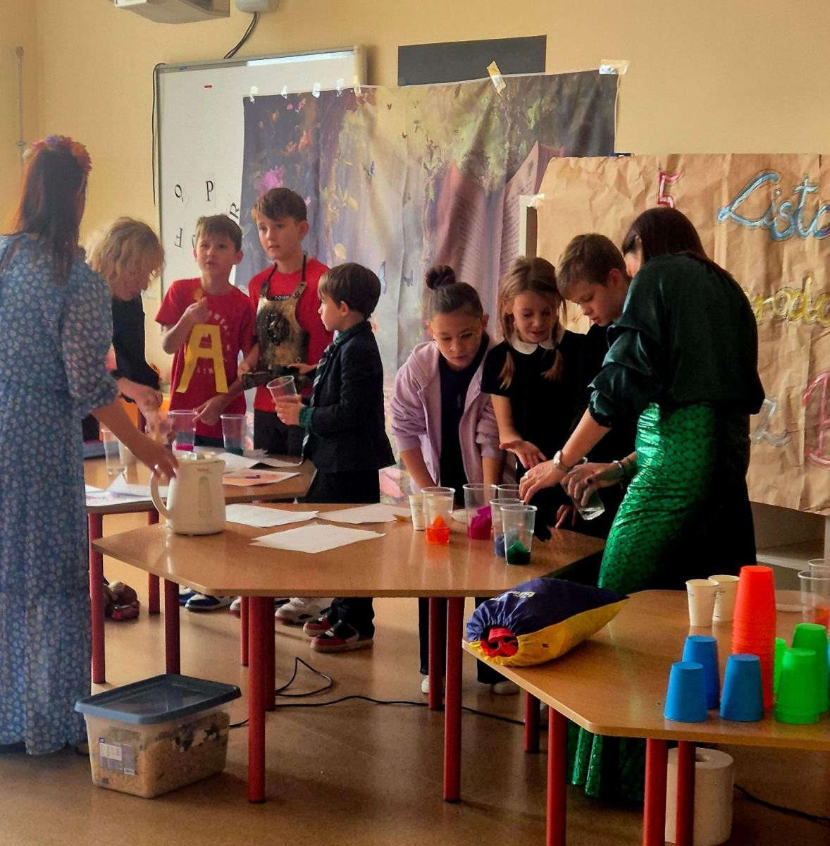 🌈 „Tęcza w szklance” – magiczne doświadczenie, w którym udział wzięła… sama dyrekcja i nauczyciele! (Podobno od tego momentu wszyscy mają jeszcze bardziej kolorowe nastroje 😉).