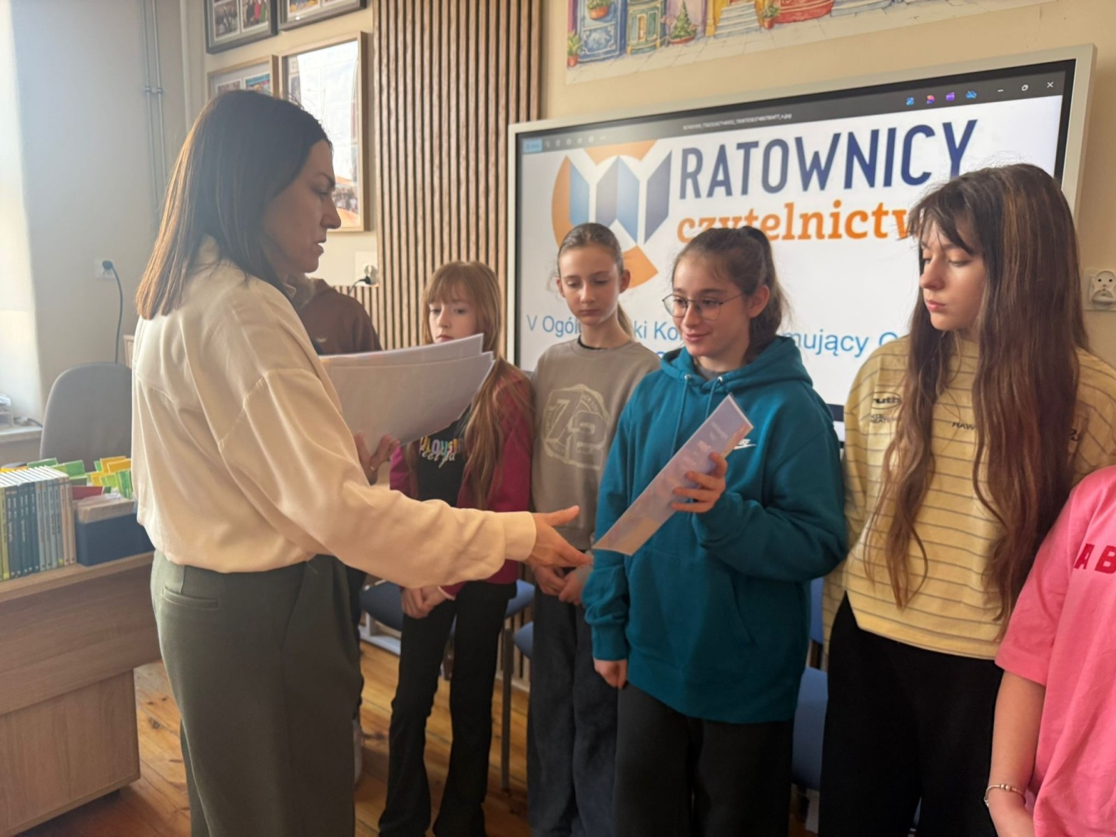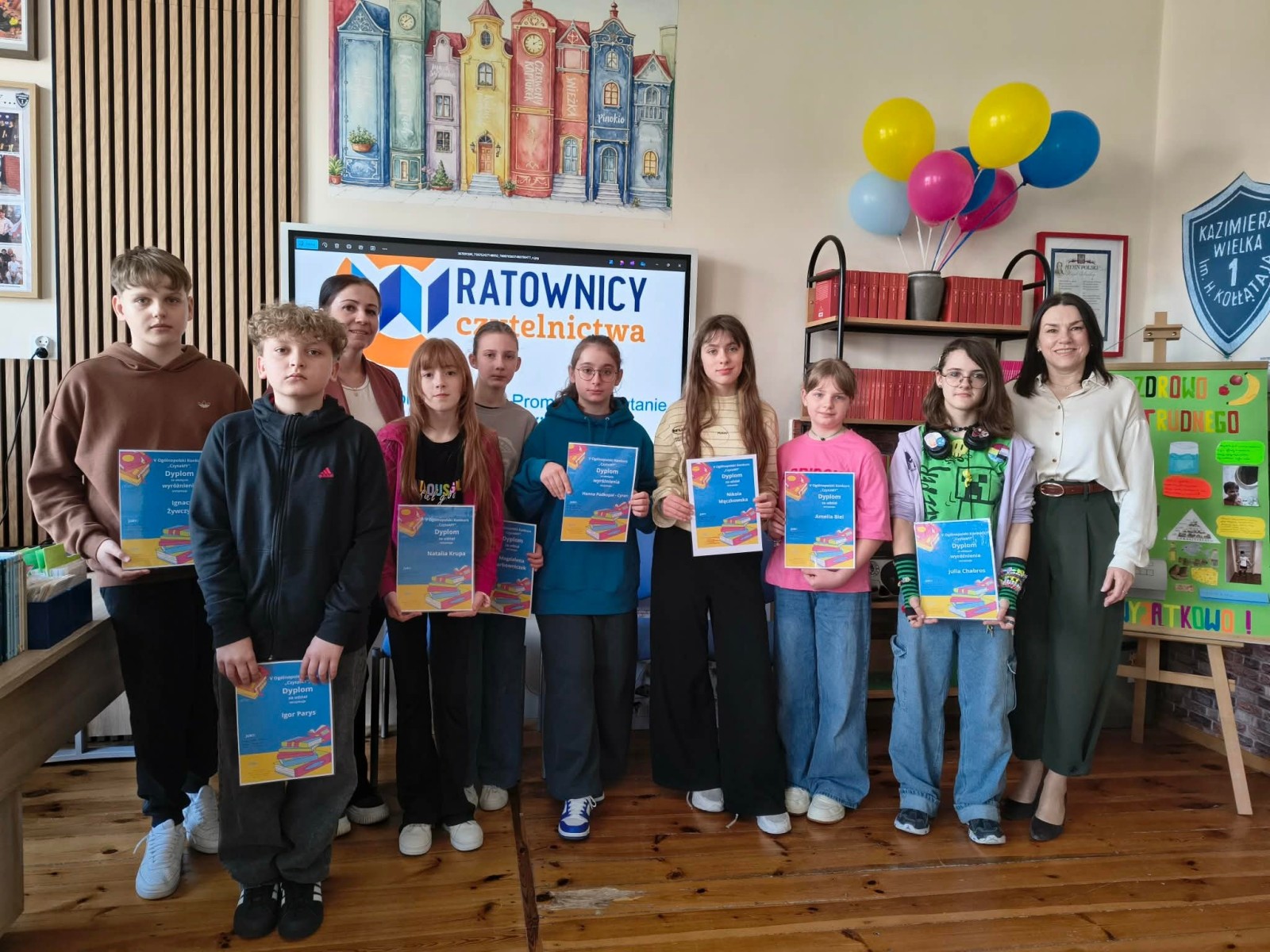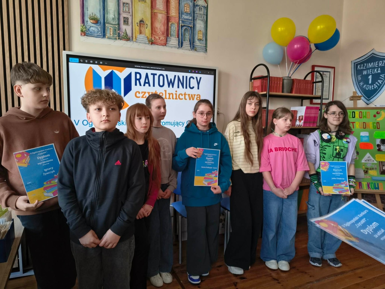 Z przyjemnością informujemy, że zakończył się szkolny etap V edycji Ogólnopolskiego Konkursu Promującego Czytanie „CzytaMy”. Podczas uroczystego spotkania p. Wicedyrektor Aneta Gądzik wręczyła wszystkim uczestnikom pamiątkowe dyplomy. Wyróżnione zostały trzy osoby: Hanna Podkopał- Cyran, Ignacy Żywczyk, Julia Chabros. To ich prace będą reprezentować naszą szkołę na kolejnym etapie konkursu. Wszystkim uczestnikom dziękujemy za kreatywność, zaangażowanie i miłość do czytania.