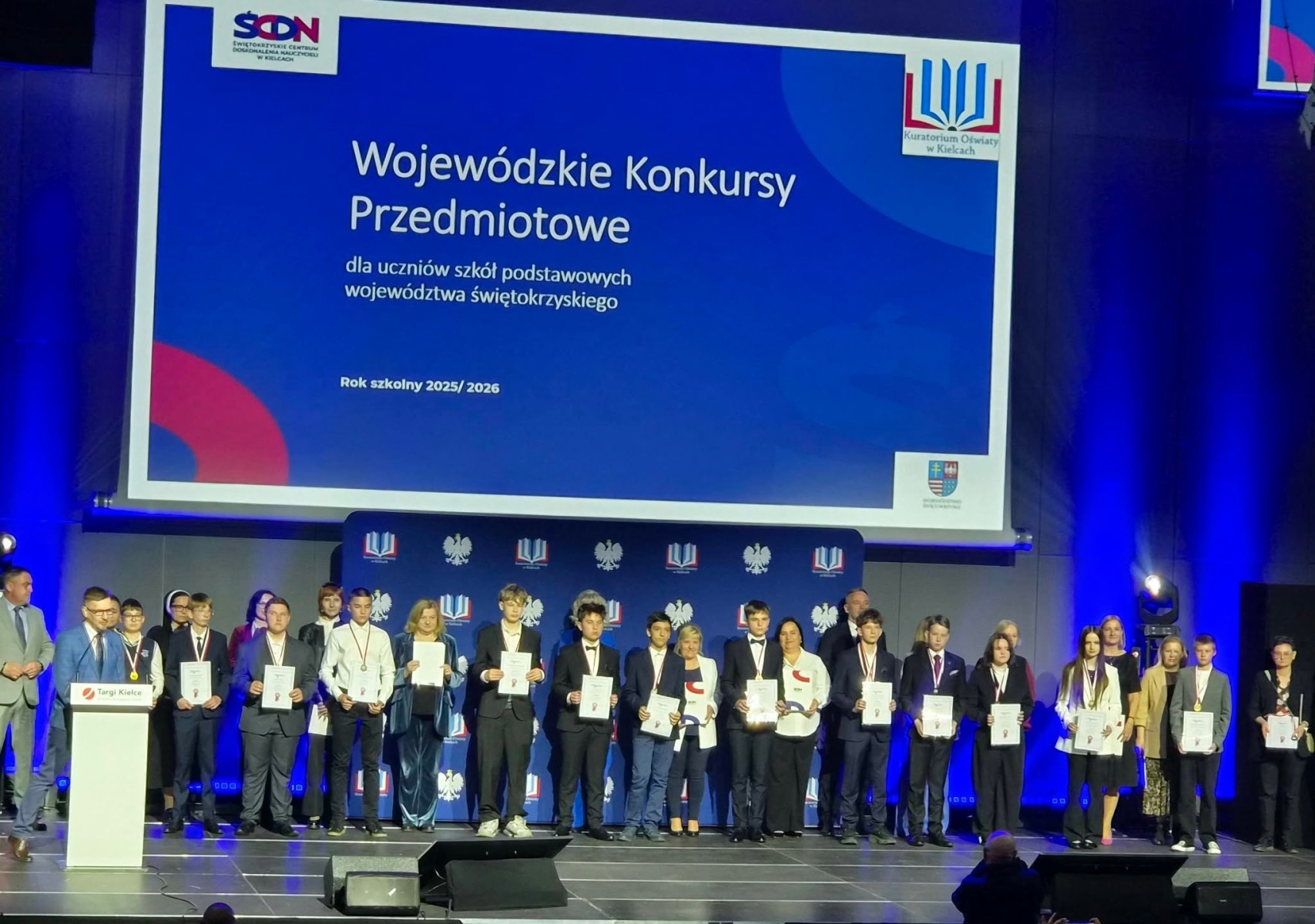 28 kwietnia 2026 roku w sali konferencyjnej OMEGA w Centrum Kongresowym Targów Kielce odbyło się uroczyste wręczenie laureatom wojewódzkich konkursów przedmiotowych dyplomów, zaświadczeń i medali przez Świętokrzyskiego Kuratora Oświaty Piotra Łojka oraz dyrektora Świętokrzyskiego Centrum Doskonalenia Nauczycieli w Kielcach Małgorzatę Łakomiec.