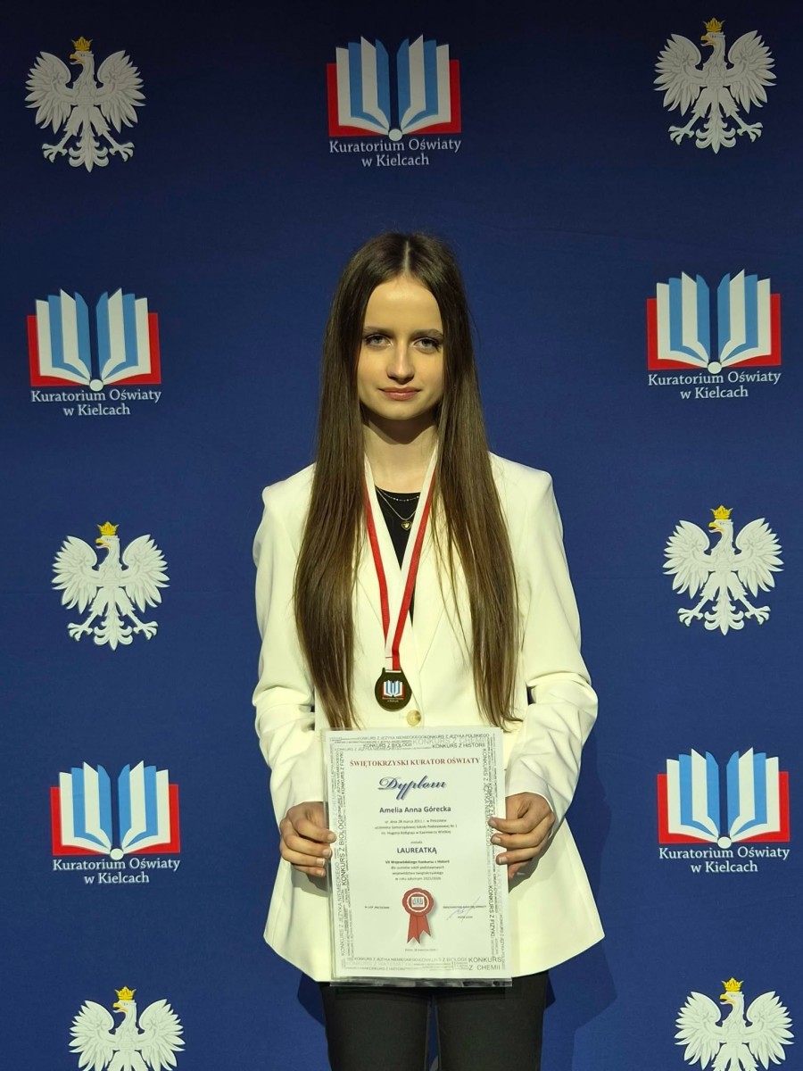 AMELIA GÓRECKA (8a) odebrała Medal oraz Dyplom Laureata z rąk Świętokrzyskiego Kuratora Oświaty podczas GALI LAUREATÓW KONKURSÓW PRZEDMIOTOWYCH 2025/2026.