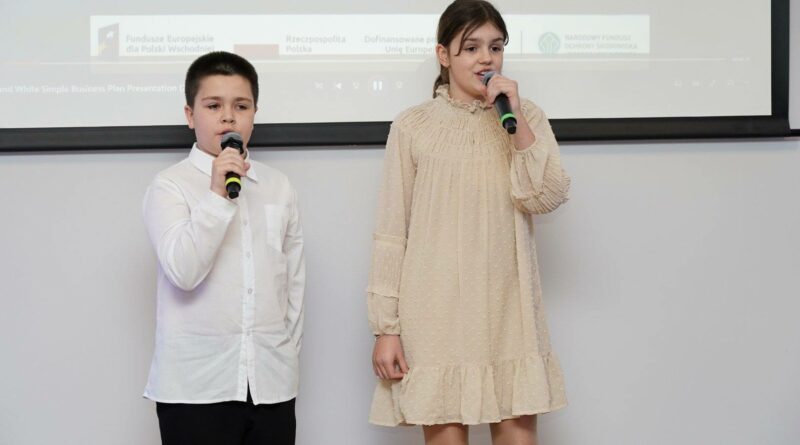 HANIA JAROSZ i WIKTOR BONAR zauroczyli zebranych wykonaniem w duecie piosenek „Szukaj mnie” oraz „Najtrudniejszy pierwszy krok”. Opiekunem Hani i Wiktora jest pan Grzegorz Krawczuk, nauczyciel muzyki.