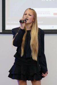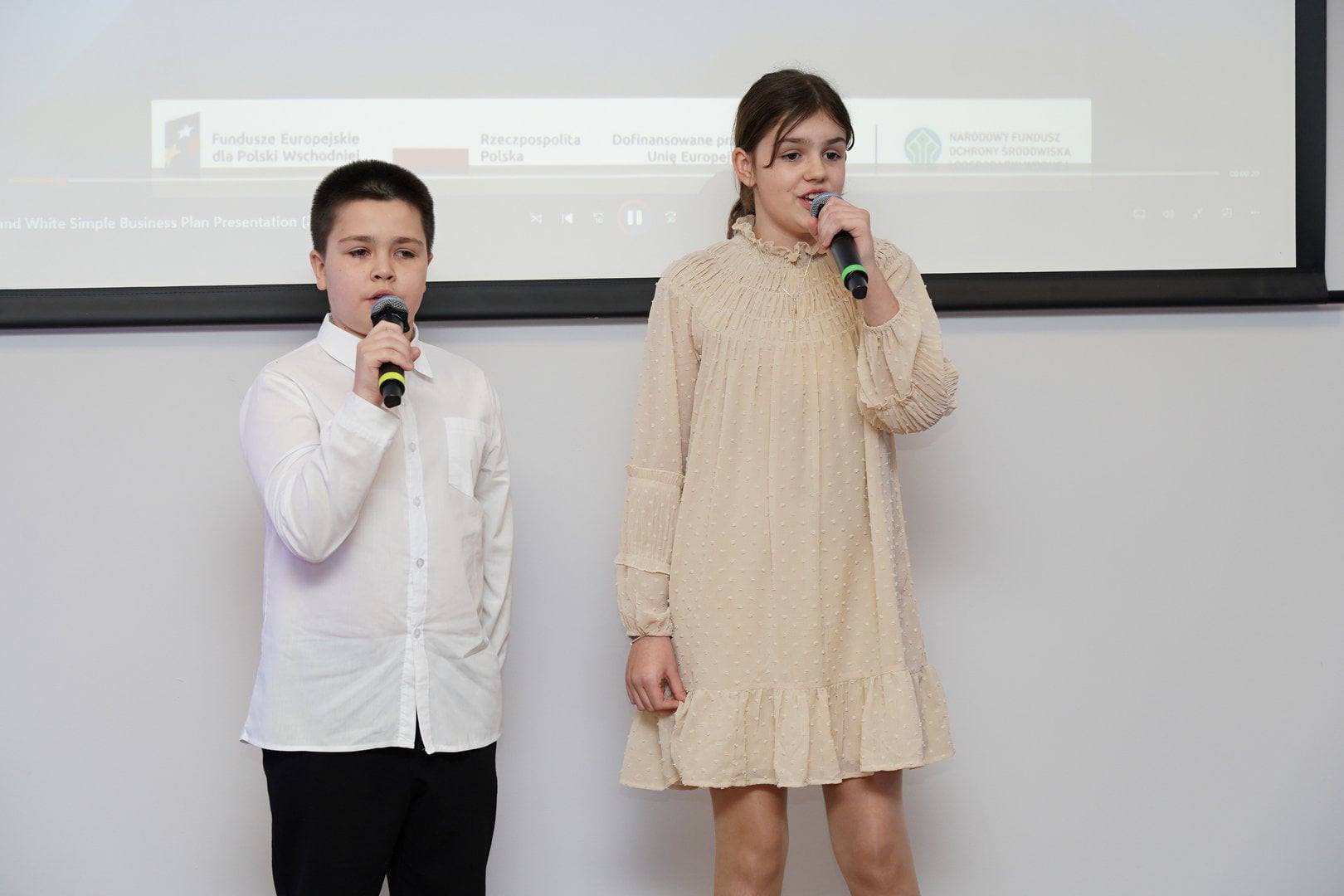 HANIA JAROSZ i WIKTOR BONAR zauroczyli zebranych wykonaniem w duecie piosenek „Szukaj mnie” oraz „Najtrudniejszy pierwszy krok”. Opiekunem Hani i Wiktora jest pan Grzegorz Krawczuk, nauczyciel muzyki.
