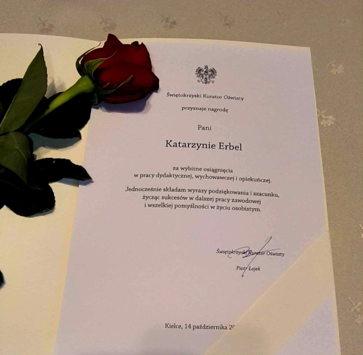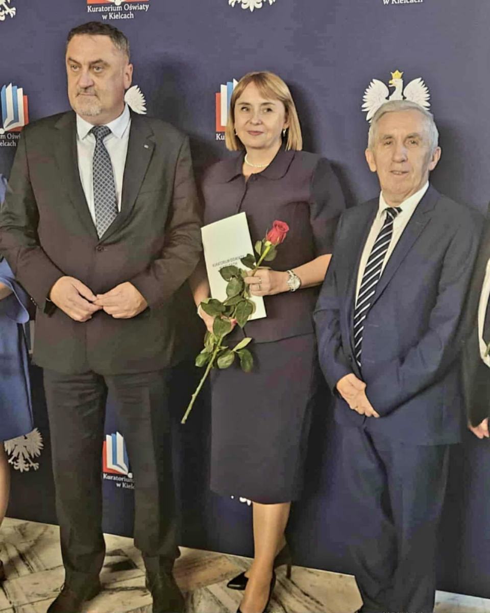 Z ogromną radością informujemy, że Pani Dyrektor Katarzyna Erbel w dn. 24 października 2025r. otrzymała Nagrodę Świętokrzyskiego Kuratora Oświaty. To wyjątkowe wyróżnienie odebrała za osiągnięcia dydaktyczne, wychowawcze i opiekuńcze, które są wyrazem wielkiego zaangażowania, pasji i codziennej pracy na rzecz dzieci, młodzieży, szkoły i społeczności lokalnej.