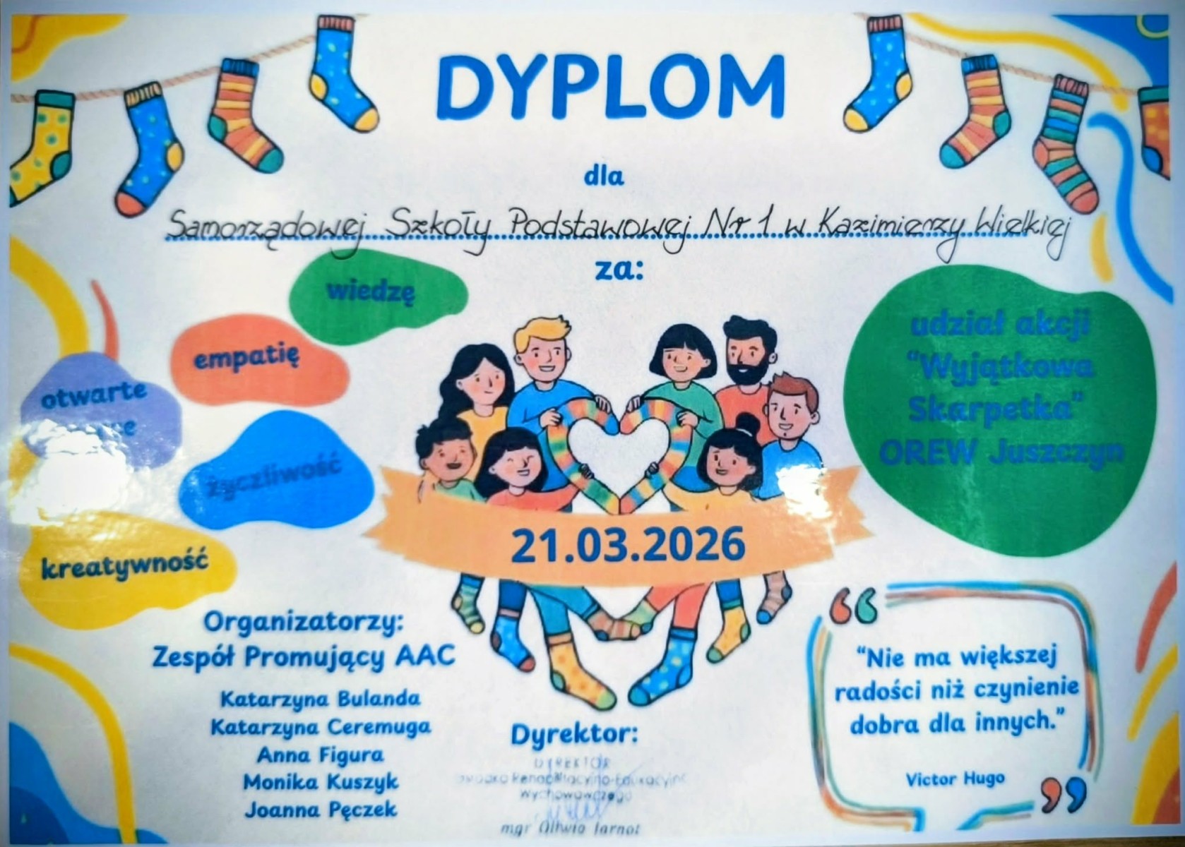Wraz z Dyrekcją szkoły, panią Katarzyną Erbel, oraz panią Pauliną Malec wręczyliśmy uczestnikom dyplomy i drobne upominki – jako wyraz uznania za ich zaangażowanie i wielkie serca. 👏