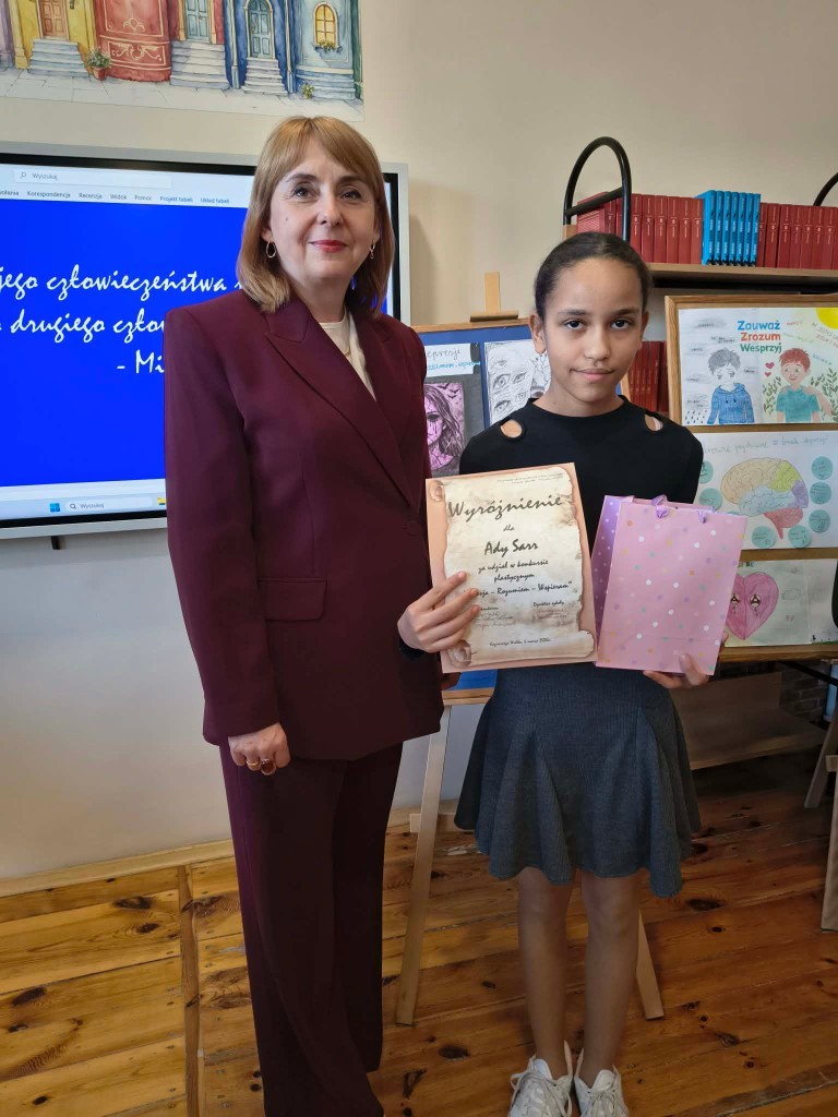 Dyrektor szkoły – p. Katarzyna Erbel w przesłaniu skierowanym do uczniów, iż „miarą ich człowieczeństwa jest wielkość troski o drugiego człowieka”, nawiązała do wartości, które uczniowie wyrazili w pracach plastycznych: empatii, pomocy, wsparcia i wrażliwości na potrzeby innych.