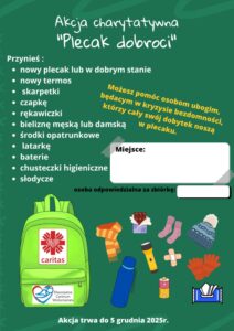 podczas akcji charytatywnej” Plecak dobroci” dla osób w kryzysie bezdomności, które swój dobytek noszą w plecaku. Zebrane dary zostały przekazane do najbardziej potrzebujących w obszarze świętokrzyskim.