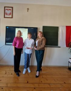 Dzisiaj Ignaś odebrał nagrodę z rąk p. Dyrektor Katarzyny Erbel i opiekunki p. Moniki Anielskiej.