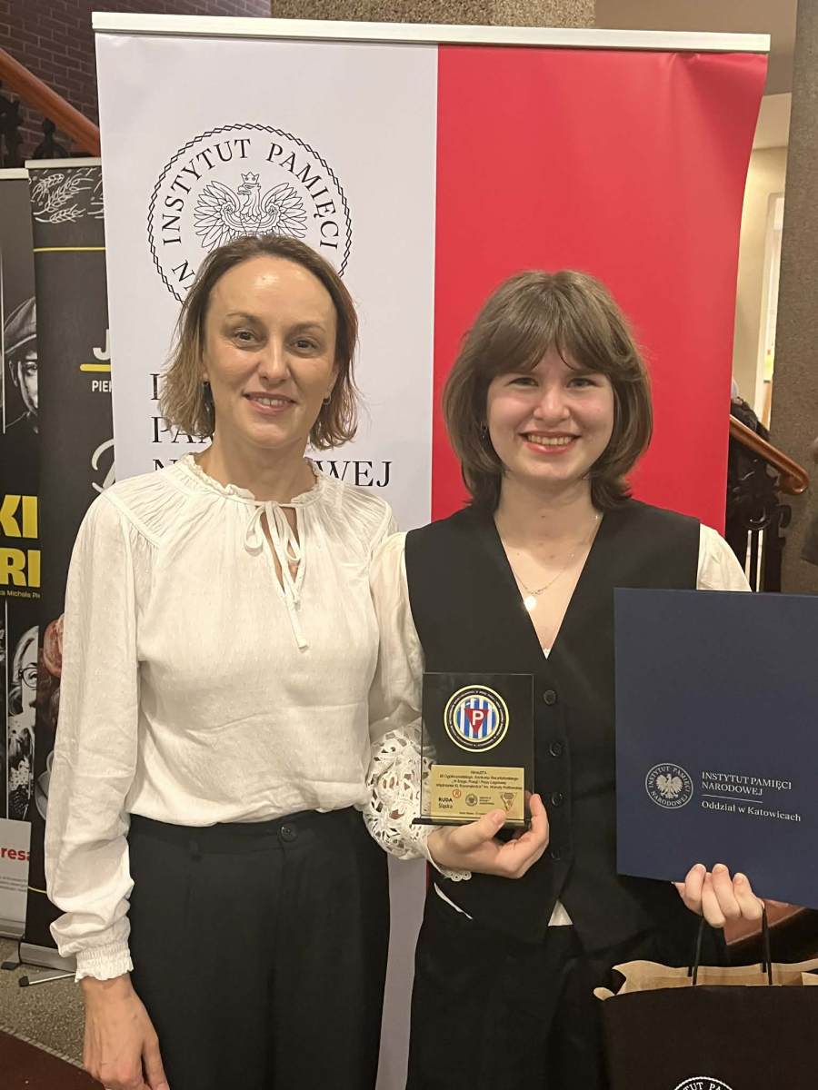 15 kwietnia 2026 r. w Śląskim Teatrze Impresaryjnym im. Henryka Bisty w Rudzie Śląskiej odbył się finał XII edycji ogólnopolskiego konkursu recytatorskiego „W kręgu poezji i prozy lagrowej więźniarek KL Ravensbrück” im. Wandy Półtawskiej. W wydarzeniu uczestniczyły także więźniarki niemieckich obozów koncentracyjnych Krystyna Paradyż (FKL Ravensbruck) i Irena Cyrankiewicz (KL Auschwitz-Birkenau). Wśród 29 uczestników z różnych stron Polski wspaniale reprezentowała naszą szkołę się Zofia Zachara, która otrzymała zaszczytny tytuł finalisty konkursu. Zosiu, jesteśmy z Ciebie dumni! Opiekunką Zosi jest pani Katarzyna Borycka.